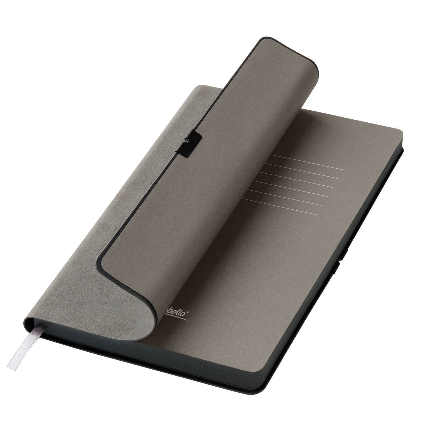 Коллекция In Velour - образец удачного сочетания минимализма со стильными элементами дизайна. Элегантный классический серый цвет мягкой обложки обыгрывается горизонтальной фиксирующей резинкой. Чтобы избежать повреждений обложки, на обеих ее сторонах под резинку установлен металлический фиксатор цвета черный никель - он не только улучшает внешний вид аксессуара, но и функционально полезен. Цветовой ансамбль дополняется и матовым цветным срезом, выполненным в тон обложке. Поверхность ежедневника приятна на ощупь: материал напоминает нубук и имеет бархатистую поверхность. Также эффектность аксессуара поддерживается форзацем и нахзацем серого цвета и светло-кремовыми страницами из гладкого, слегка шелковистого офсета. Серое атласное ляссе органично завершает внешний вид ежедневника.