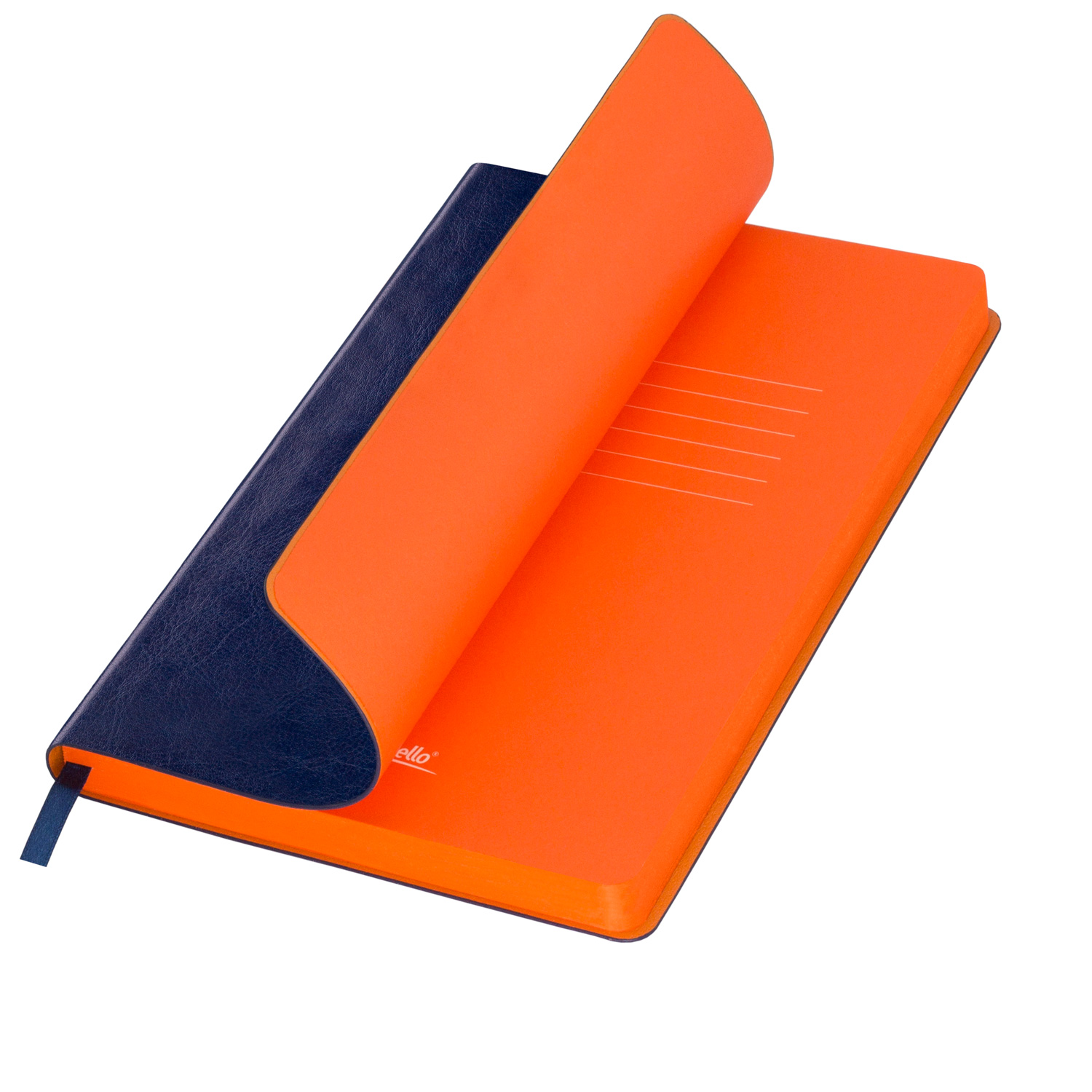 Недатированный ежедневник отличает интересная насыщенная контрастная цветовая гамма. Обложка гибкая, со скругленными уголками из искусственной кожи с эффектом «венецианской штукатурки». На ощупь поверхность гладкая, глянцевая, фактурно ощущается характерный для кожи мелкий рельеф. Не образует заломов, не расслаивается. Цвет обложки – темно-синий, глубокий, насыщенный, однородный. Тон за счет фактуры может меняться в зависимости от освещения. Цвет матовых форзаца и нахзаца – сочный оранжевый. Ярко контрастирует с обложкой. Срез матовый, выполнен в тон форзаца и нахзаца.