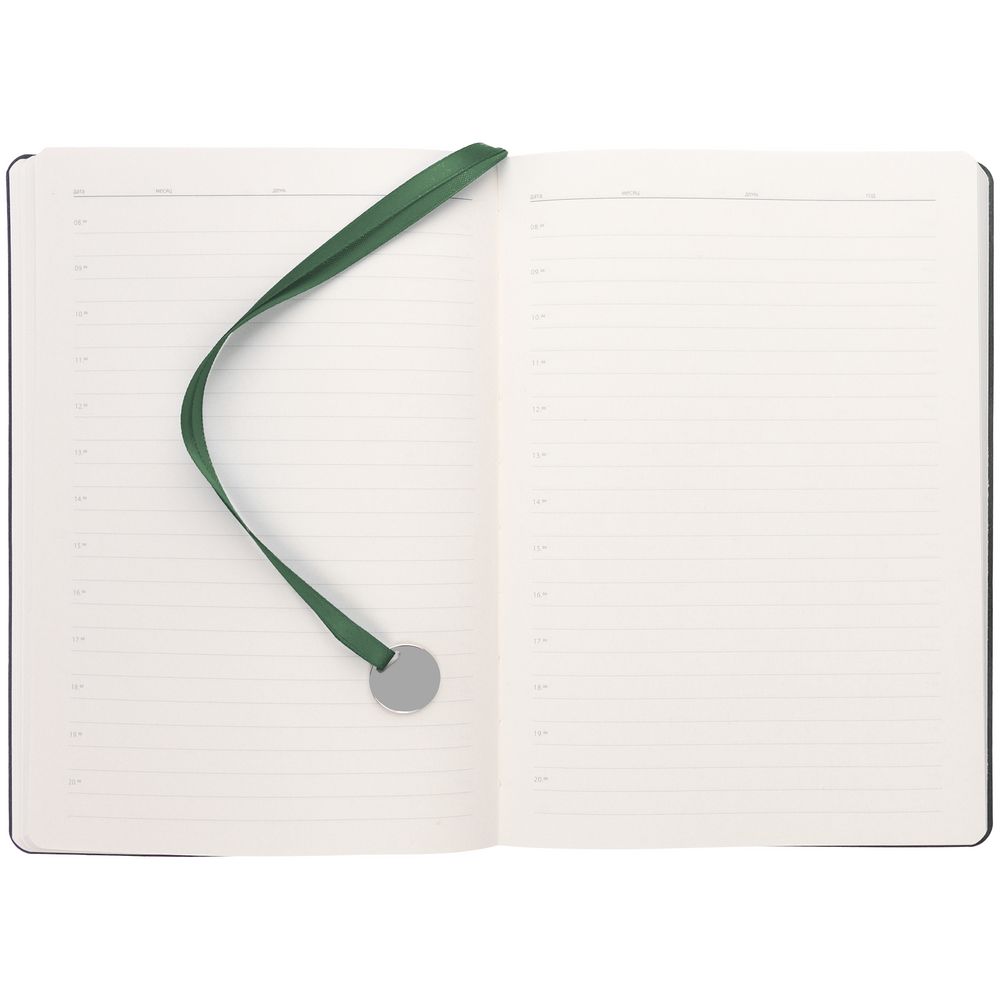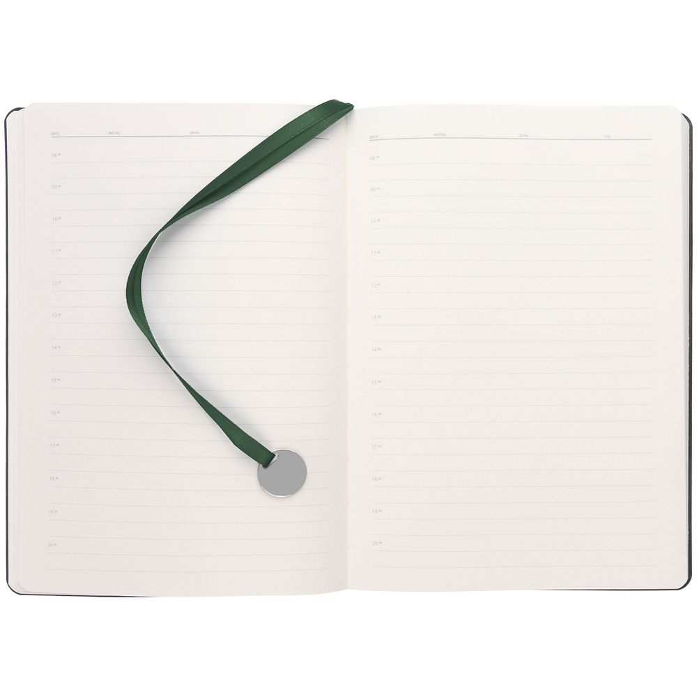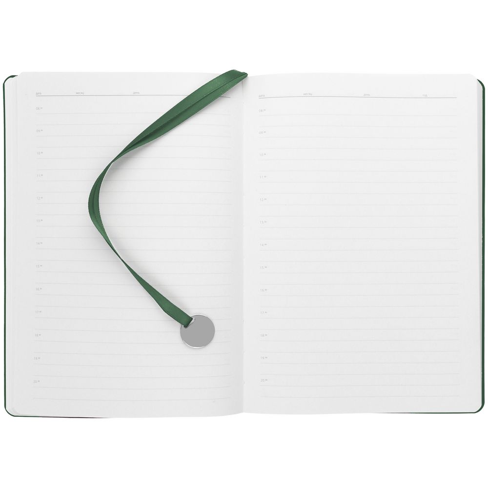 Ежедневник с твердой обложкой, выполнен из материала La Fite, зеленый, дополнен ляссе в цвет обложки с металлическим шильдом. Блок 985, без календарной сетки: