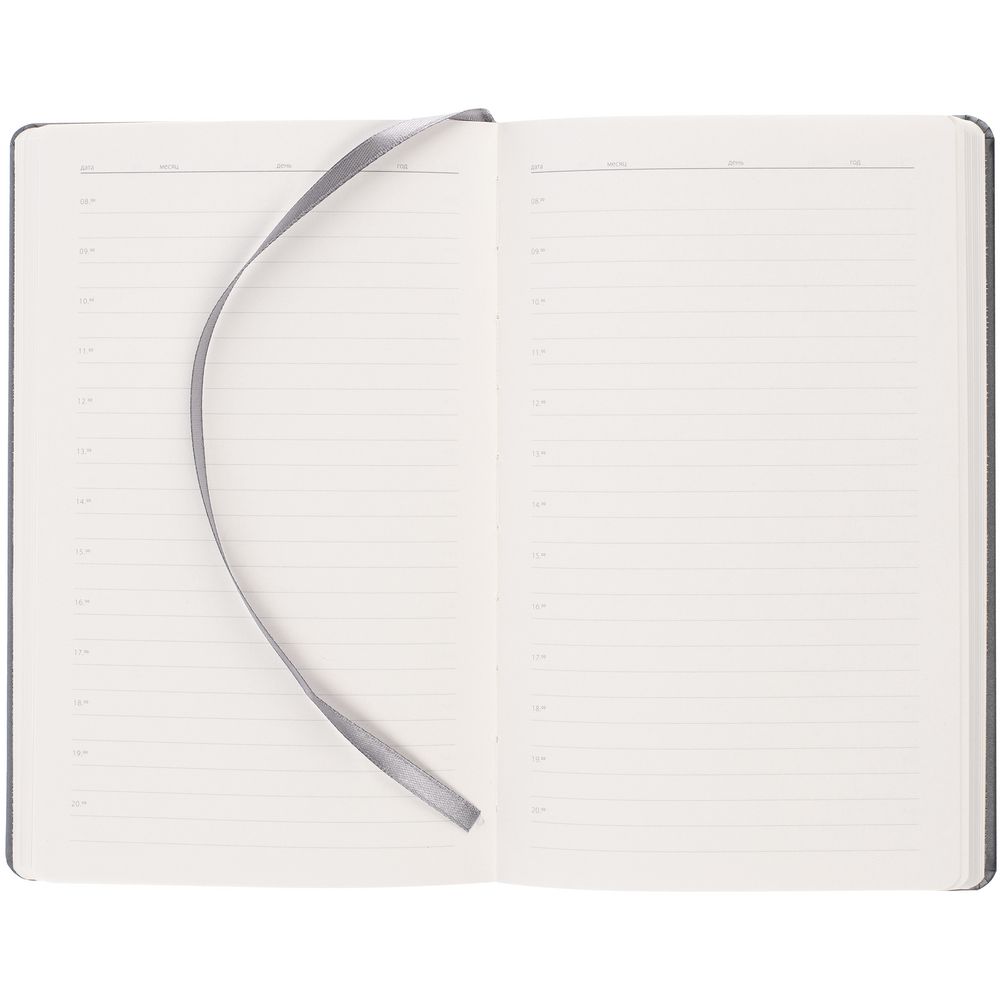 Ежедневник в твердой обложке, выполненной из материала Soft Touch Pearl, серый СС, дополнен цветным ляссе и магнитом, удерживающим ручку.