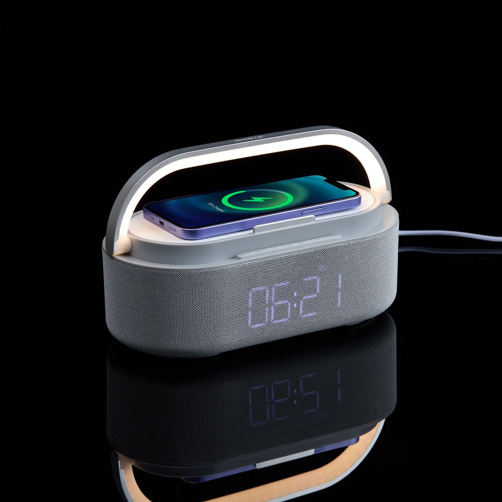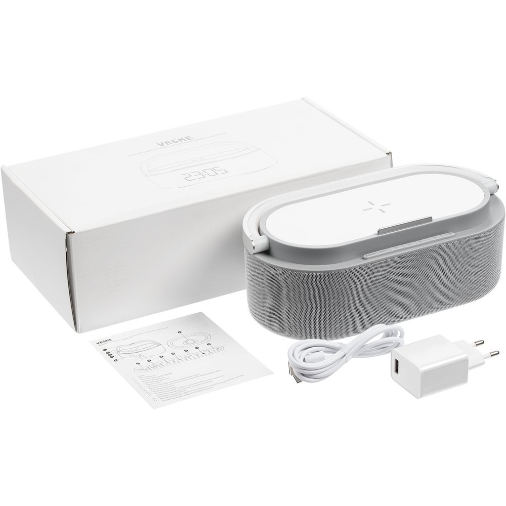 Veske — это Bluetooth-колонка с электронными часами, площадкой для беспроводной зарядки смартфона и подсветкой.
