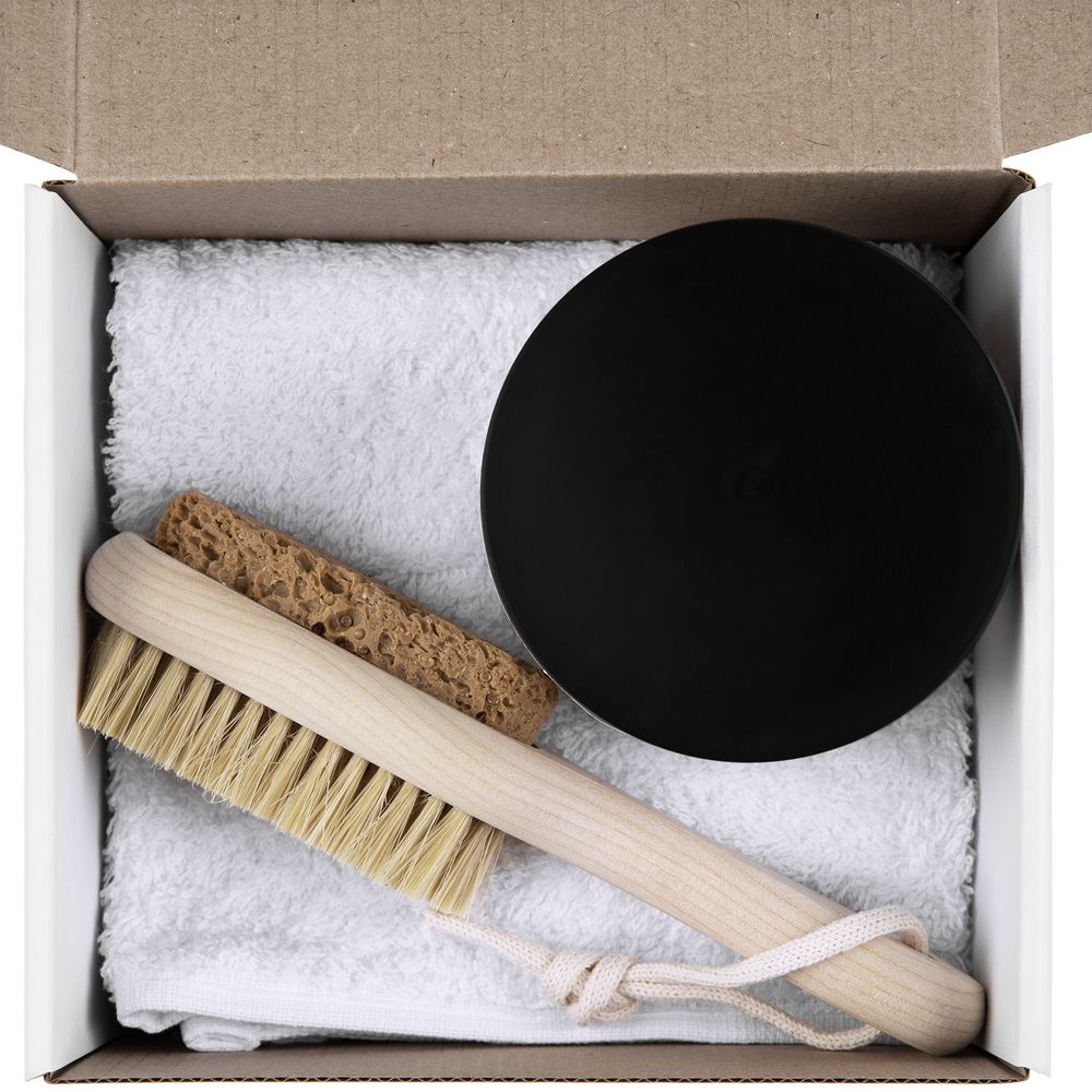 Материал: полотенце - хлопок 100%; массажная щетка - дерево, щетина кабана, искусственный камень; коробка - микрогофрокартон