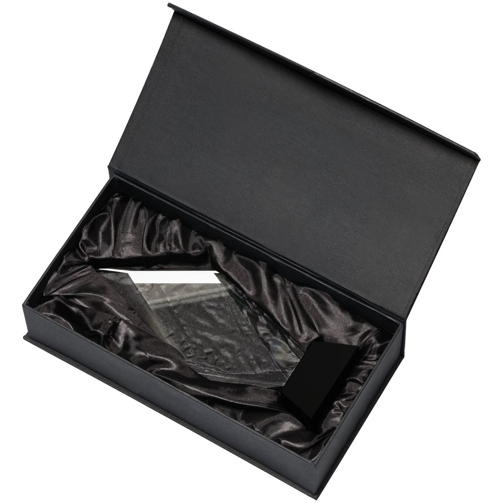 Стела изготовлена из хрусталя К9, в основе которого лежит оптическое боросиликатное стекло. Эту марку хрусталя отличает низкий процент посторонних включений, высокий показатель преломления и высокая прозрачность — идеальные качества для изготовления наград премиального уровня.