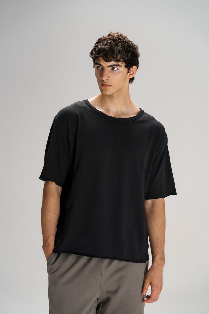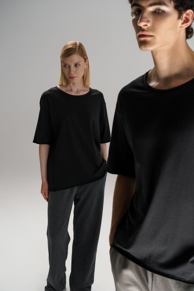 Футболка унисекс свободной посадки Vozduh создана для тех, кто следит за трендами и ценит комфорт. Необработанные края рукавов и низа изделия добавляют ему оригинальности и легкой небрежности, а боковые вставки создают притягательный летящий силуэт.