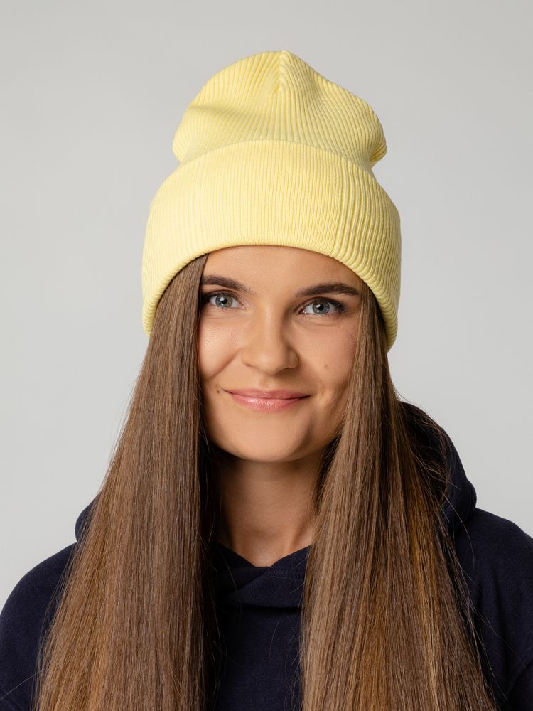 Двухслойная шапка фактурной вязки с отворотом и специальной более гладкой областью под вышивку.