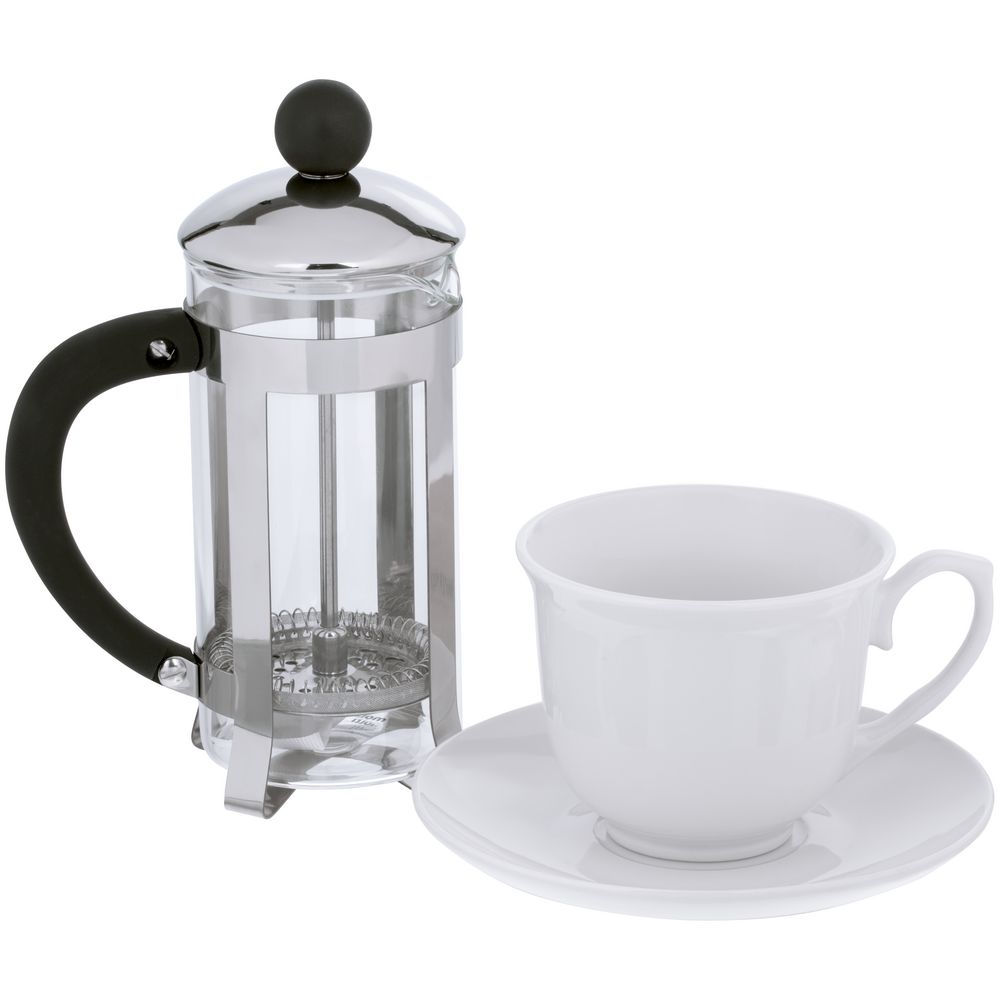 Материал: френч-пресс - боросиликатное стекло, нержавеющая сталь, пластик; чайная пара - фарфор; пакет - бумага